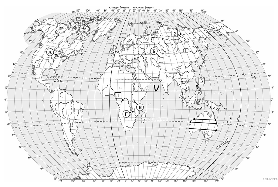 Для выполнения данного задания нужно посмотреть на выделенные параллели. В данном случае — это 20° ю. ш., 22,5° ю. ш. (южный тропик) и 30° ю. ш. на материке Австралия. Вспоминаем, какие формы рельефа есть на этом материке, как они меняются при движении с запада на восток по профилю. Далее смотрим на реки или озера, которые могут быть указаны на профиле. В данном случае, видим озеро Эйр-Норт и реку Дарлинг. А значит — это параллель 30° ю. ш.