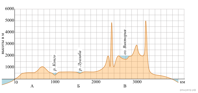 На уроке географии Андрей построил профиль рельефа Африки, представленный на рисунке. Используя рисунок и карту мира, выполните задания.