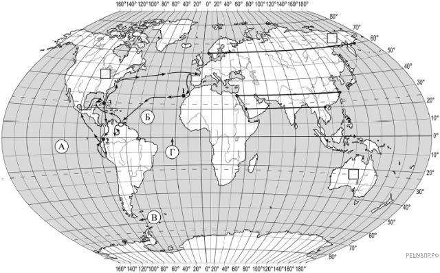 На карте мира изображён маршрут экспедиции одного из путешественников, портреты которых представлены ниже. Рассмотрите карту и портреты путешественников и выполните задания.