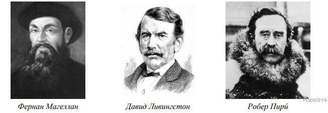 На карте мира изображён маршрут экспедиции одного из путешественников, портреты которых представлены ниже. Рассмотрите карту и портреты путешественников и выполните задания.