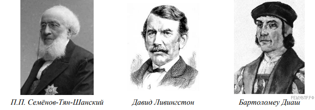 На карте мира изображён маршрут экспедиции одного из путешественников, портреты которых представлены ниже. Рассмотрите карту и портреты путешественников и выполните задания.