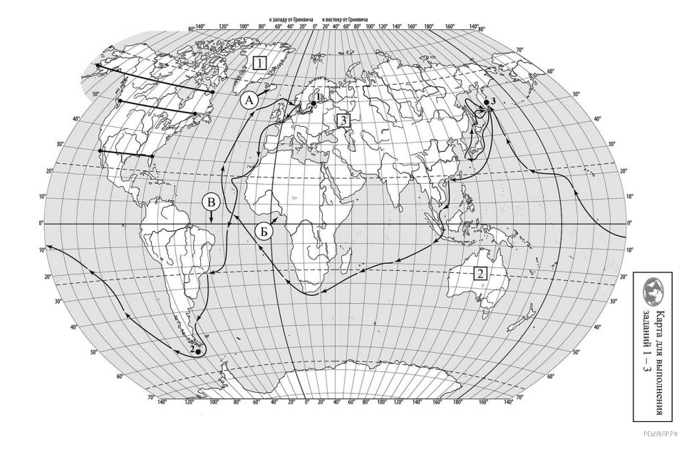 На карте буквами обозначены объекты, определяющие географическое положение океана, в котором начинался маршрут этой экспедиции. Выберите из приведённого списка и запишите в таблицу названия этих объектов.
