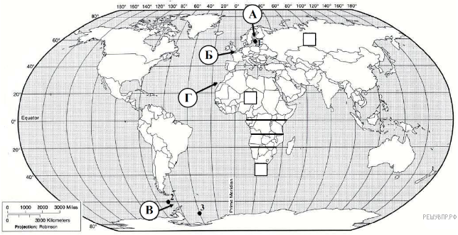 На карте мира территории, для которых построены изображённые на рисунках климатограммы, обозначены пустыми квадратами. Впишите в каждый квадрат на карте мира номер соответствующей климатограммы.