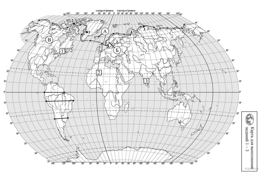 По линиям маршрутов экспедиций отмечены точки, расположенные на территории крупных географических объектов. Определите и запишите в ответе географические координаты точки 2.