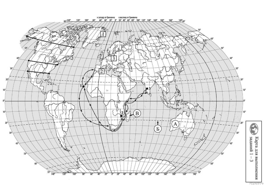На карте буквами обозначены объекты, определяющие географическое положение океана, в котором начинался маршрут этой экспедиции. Выберите из приведённого списка и запишите в таблицу названия этих объектов.