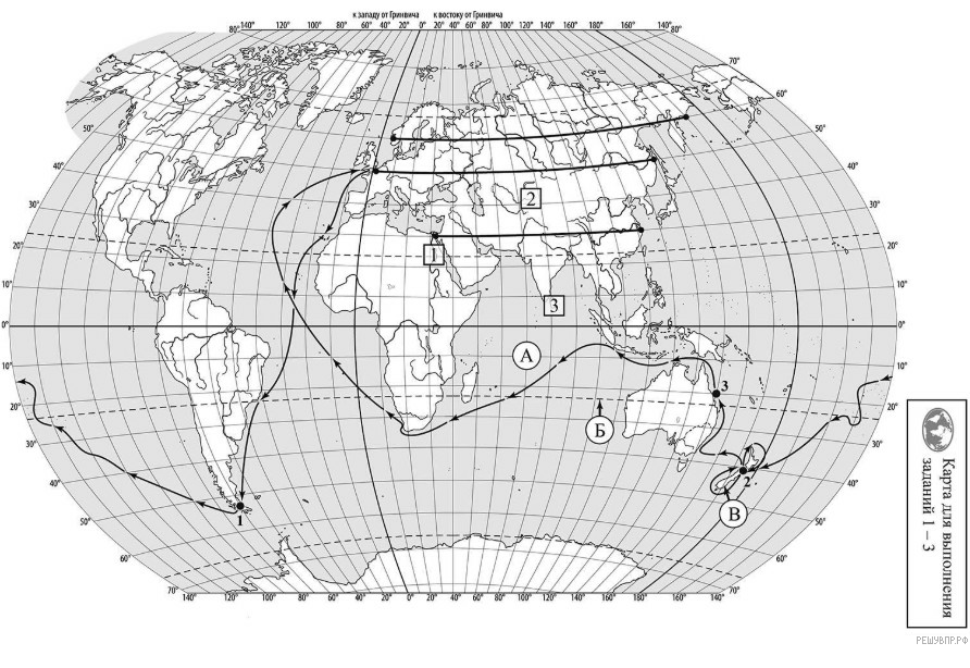 На карте буквами обозначены объекты, определяющие географическое положение океана, в котором начинался маршрут этой экспедиции. Выберите из приведённого списка и запишите в таблицу названия этих объектов.