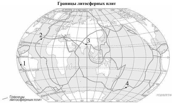 Определите, в какой из обозначенных на карте цифрами точек происходит погружение плиты с земной корой океанического типа под плиту с корой материкового типа.