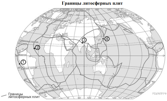 Определите, в какой из обозначенных на карте цифрами точек на границе литосферных плит происходит процесс образования подводных гор.