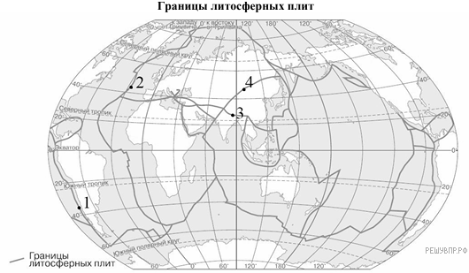 Определите, в какой из обозначенных на карте цифрами точек происходит процесс раздвижения литосферных плит с земной корой океанического типа.