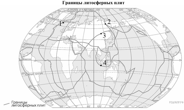 Определите, в какой из обозначенных на карте цифрами точек происходит процесс столкновения литосферных плит с земной корой материкового типа.