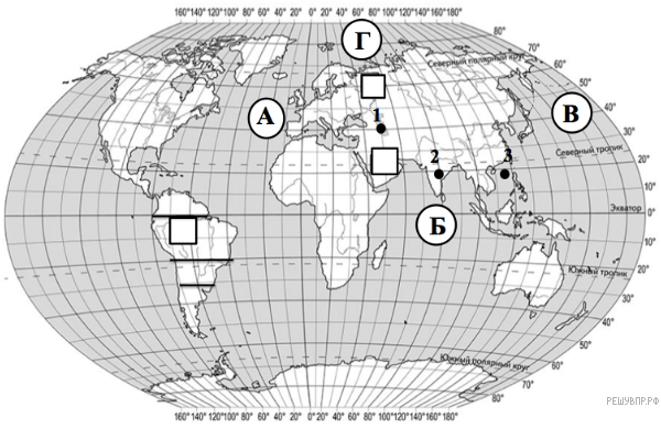 На карте мира территории, для которых построены изображённые на рисунках климатограммы, обозначены пустыми квадратами. Впишите в каждый квадрат на карте мира номер соответствующей климатограммы.