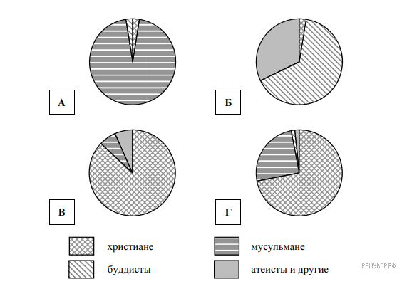 Определите, религиозный состав населения какой страны отражает каждая диаграмма. Запишите в ответе порядковые номера стран под соответствующими буквами.