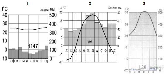 Выберите климатограмму, соответствующую климатическим особенностям указанной Вами природной зоны. Укажите в ответе её номер.