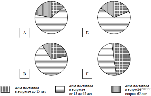 Определите, возрастной состав населения какой страны отражает каждая диаграмма. Запишите в ответе порядковые номера стран под соответствующими буквами.