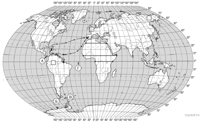 На карте мира изображён маршрут экспедиции одного из путешественников, портреты которых представлены ниже. Рассмотрите карту и портреты путешественников и выполните задания.
