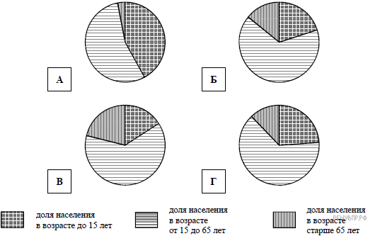 Определите, возрастной состав населения какой страны отражает каждая диаграмма. Запишите в ответе порядковые номера стран под соответствующими буквами.