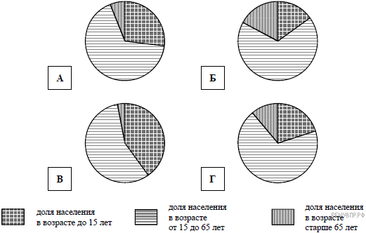 Определите, возрастной состав населения какой страны отражает каждая диаграмма. Запишите в ответе порядковые номера стран под соответствующими буквами.
