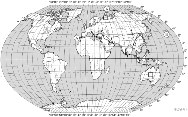 На карте мира, территории, для которых построены изображённые на рисунках климатограммы, обозначены пустыми квадратами. Впишите в каждый квадрат на карте номер соответствующей климатограммы.