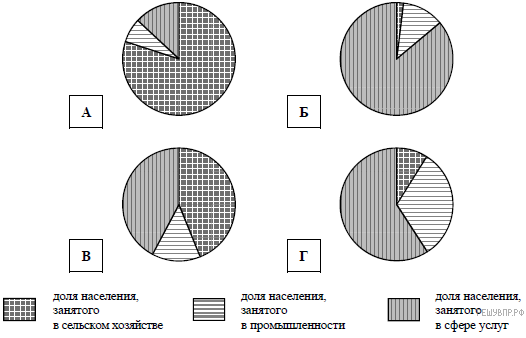 Определите, структуру занятости населения какой страны отражает каждая диаграмма. Запишите в ответе порядковые номера стран под соответствующими буквами.