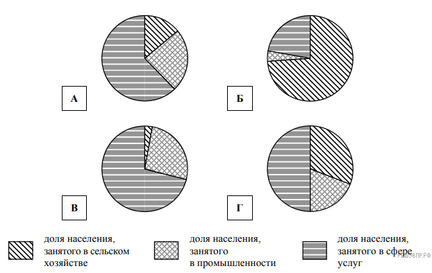 Определите, структуру занятости населения какой страны отражает каждая диаграмма. Запишите в ответе порядковые номера стран под соответствующими буквами.