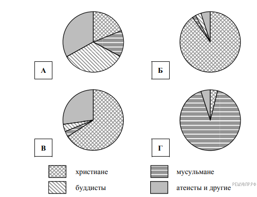 Определите, религиозный состав населения какой страны отражает каждая диаграмма. Запишите в ответе порядковые номера стран под соответствующими буквами.