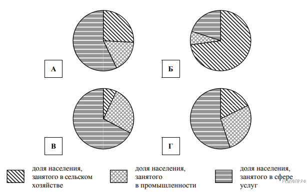 Определите, структуру занятости населения какой страны отражает каждая диаграмма. Запишите в ответе порядковые номера стран под соответствующими буквами.