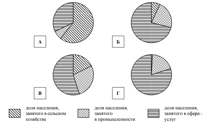 Определите, структуру занятости населения какой страны отражает каждая диаграмма. Запишите в ответе порядковые номера стран под соответствующими буквами.