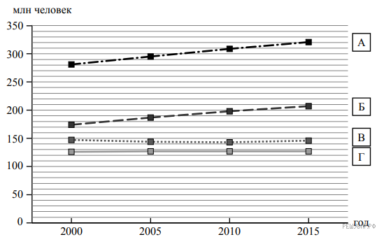 Определите, рост численности населения какой страны отражает каждый график. Запишите в ответе порядковые номера стран под соответствующими буквами.