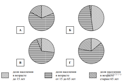 Определите, возрастной состав населения какой страны отражает каждая диаграмма. Запишите в ответе порядковые номера стран под соответствующими буквами.
