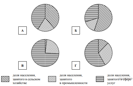 Определите, возрастной состав населения какой страны отражает каждая диаграмма. Запишите в ответе порядковые номера стран под соответствующими буквами.