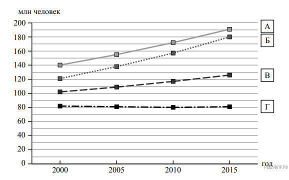 Определите, рост численности населения какой страны отражает каждый график. Запишите в ответе порядковые номера стран под соответствующими буквами.