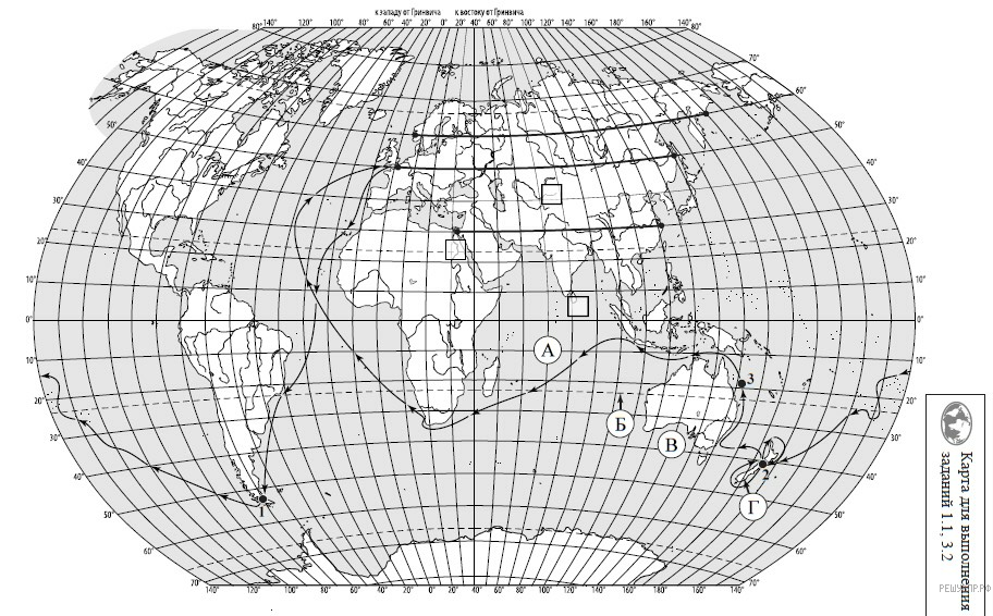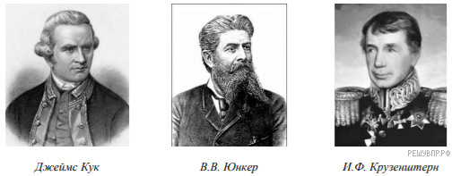 На карте мира изображён маршрут экспедиции одного из путешественников, портреты которых представлены ниже. Рассмотрите карту и портреты путешественников и выполните задания.