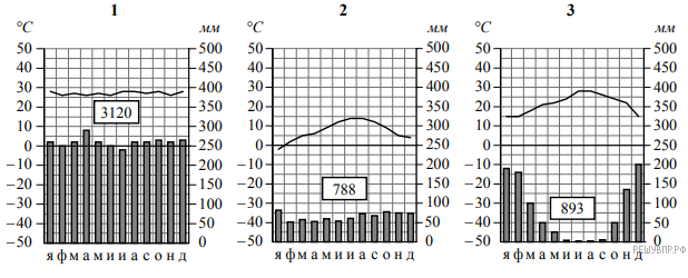 Выберите климатограмму, соответствующую климатическим особенностям указанной Вами природной зоны. Укажите в ответе её номер.