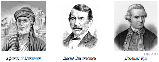 На карте мира изображён маршрут экспедиции одного из путешественников, портреты которых представлены ниже. Рассмотрите карту и портреты путешественников и выполните задания.