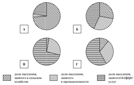Определите, структуру занятости населения какой страны отражает каждая диаграмма. Запишите в ответе порядковые номера стран под соответствующими буквами.