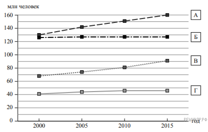Определите, рост численности населения какой страны отражает каждый график. Запишите в ответе порядковые номера стран под соответствующими буквами.